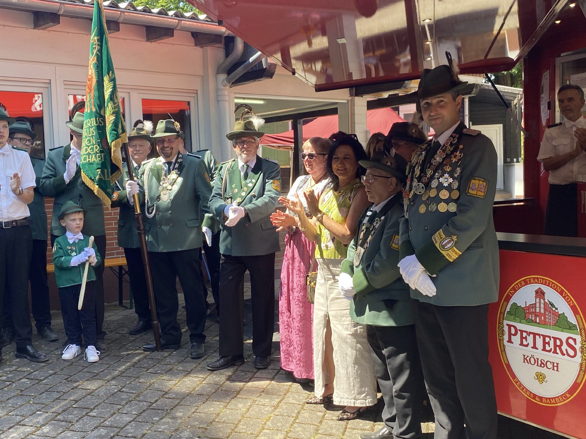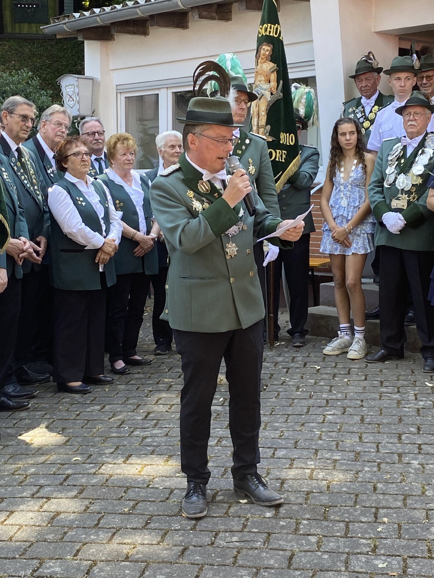 Am frühen Nachmittag begann der offizielle Teil des Festes mit der Begrüßung der Roisdorfer Majestäten, der Gastbruderschaften, der Abteilung Schießsport der Sportgemeinschaft Deutscher Bundestag sowie der zahlreichen Ehrengäste – darunter der amtierende Bornheimer Bürgermeister Christoph Becker – und selbstverständlich der Roisdorfer Bürgerinnen und Bürger sowie der Freunde unserer Schützenbruderschaft. Begrüßt wurden alle durch unseren 1. Brudermeister Walter Klemmer.