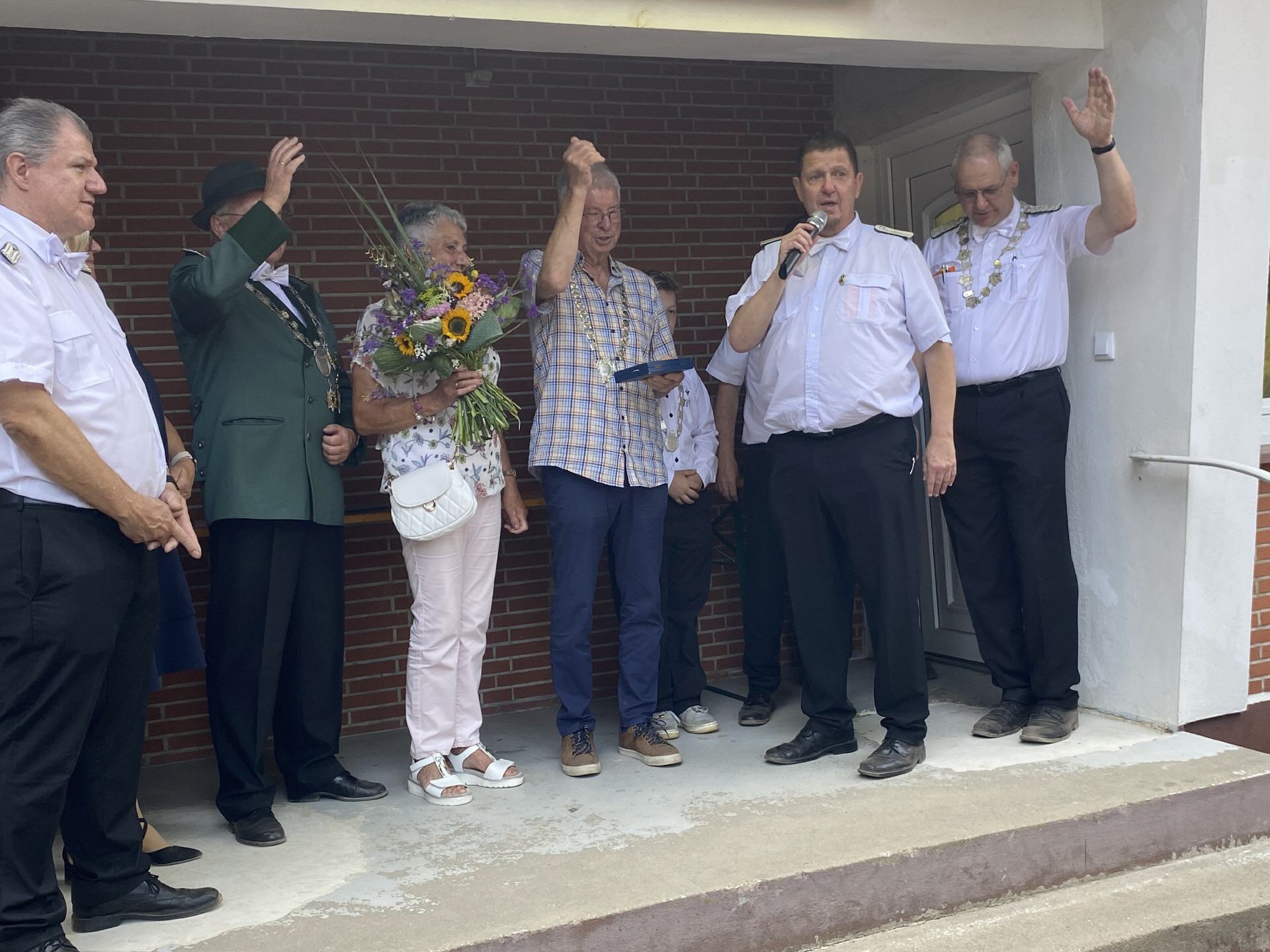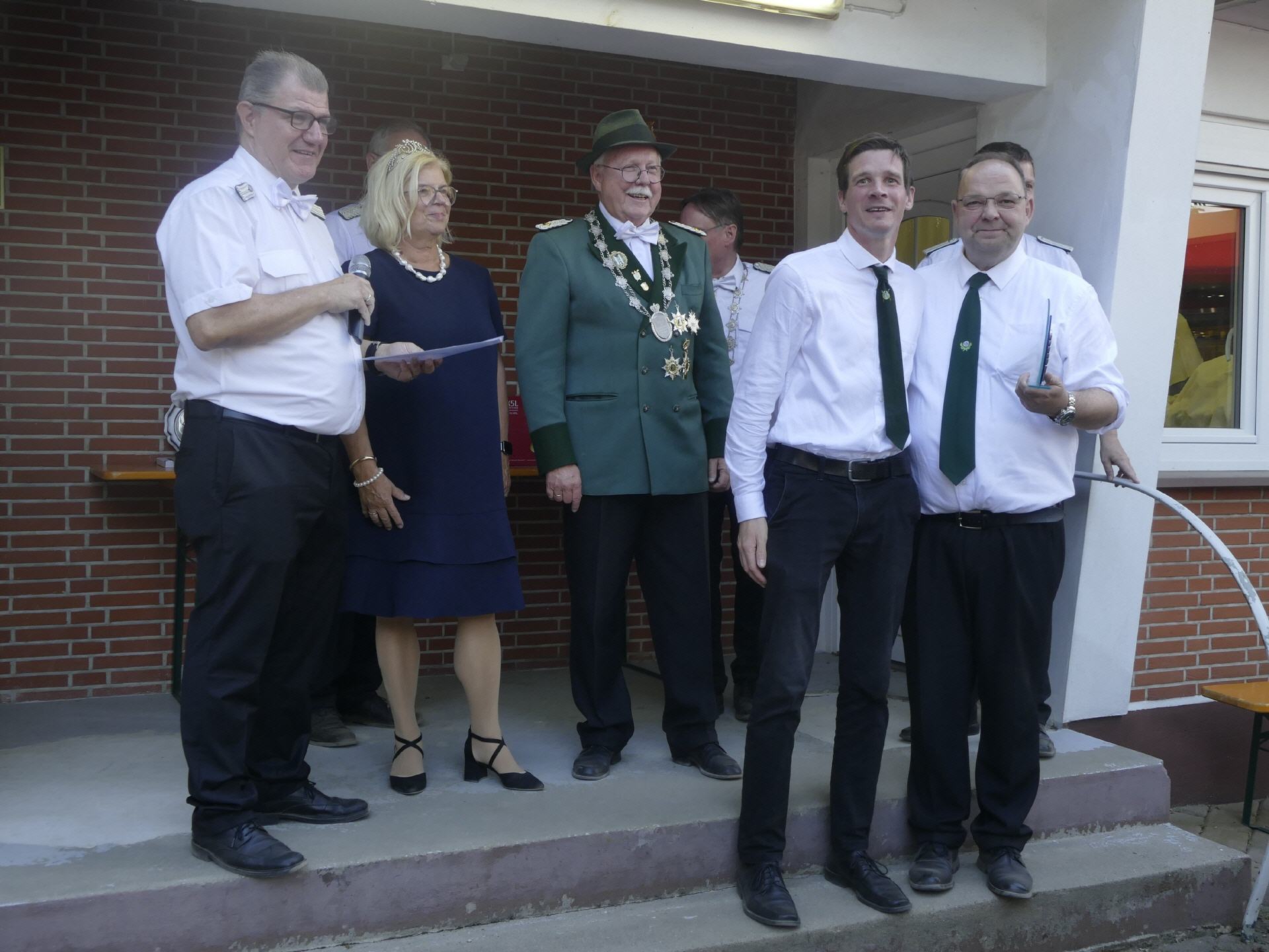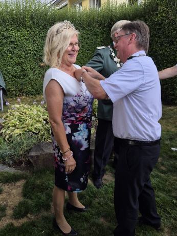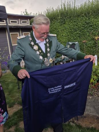 Nachdem sich alle gestärkt hatten, ließ unser 1. Brudermeister Walter Klemmer das vergangene Königsjahr noch einmal Revue passieren und dankte dem scheidenden Königspaar für ein herausragendes Jahr. Dabei überreichte er neben Königsorden und Königinnenbrosche u.a. die inzwischen traditionellen Königsschürzen.