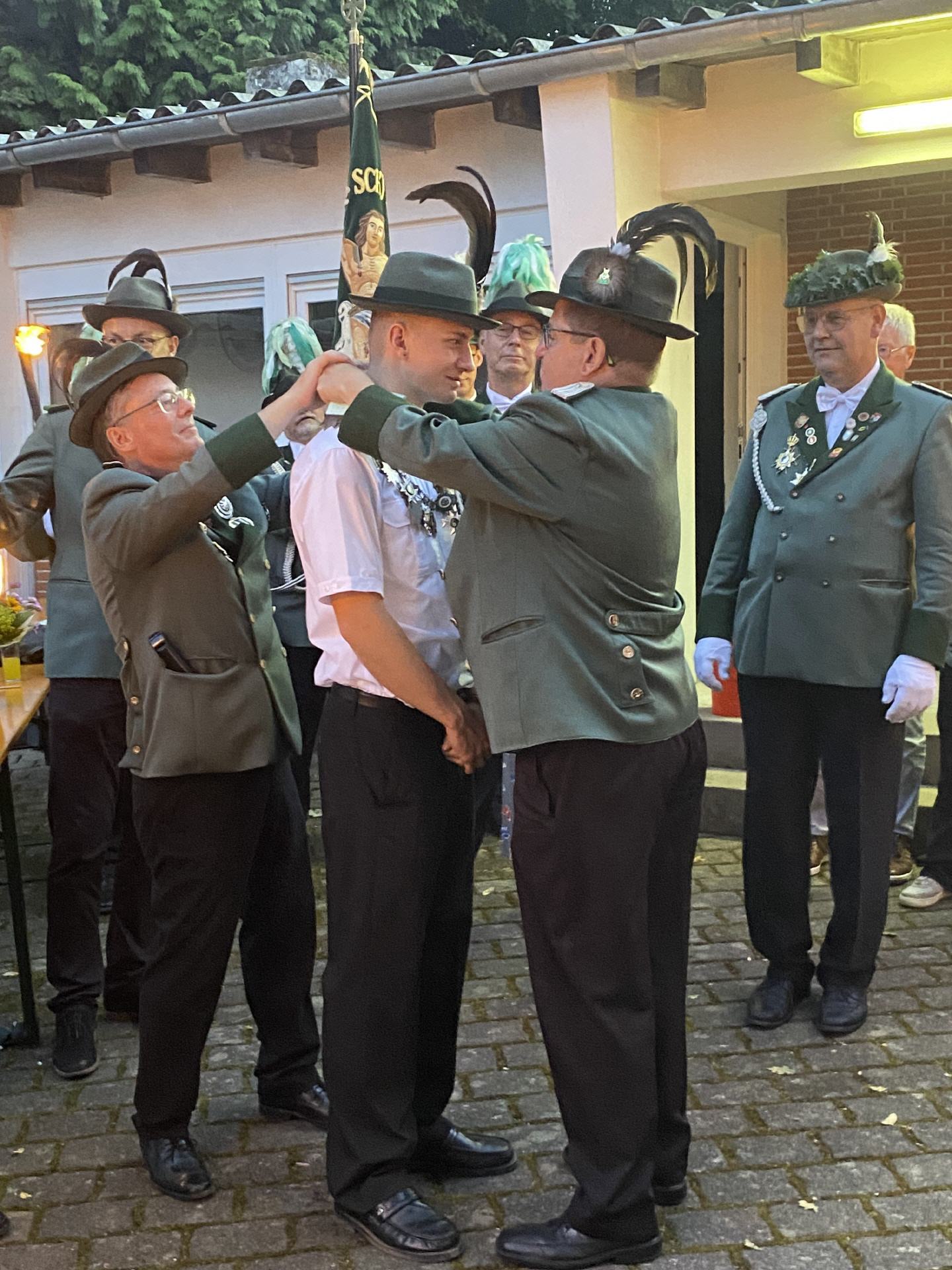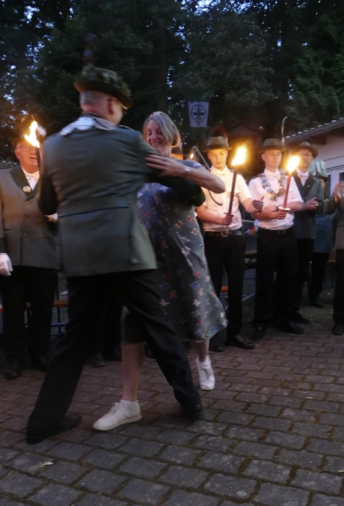 Nach zahlreichen Glückwünschen versammelte sich die Bruderschaft bei Fackelschein zur feierlichen Krönung der neuen Majestäten, durchgeführt von unserem 1. Brudermeister und Präses Adi Halbach.
