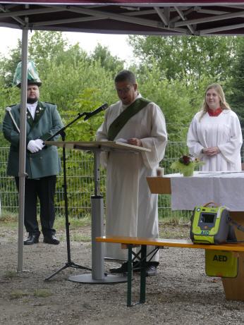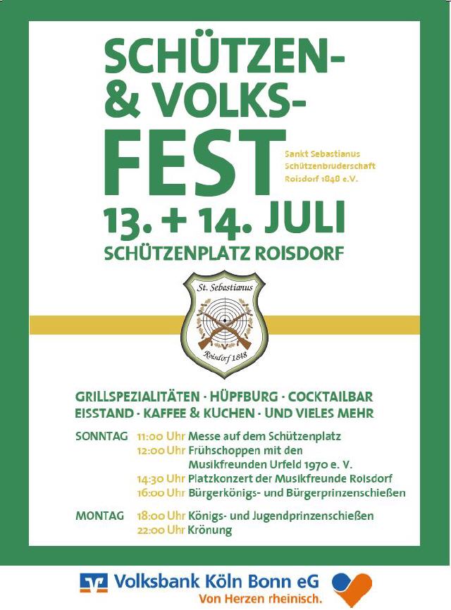 Nach dem großen Zuspruch im Vorjahr begann das Schützenfest erneut am späten Sonntagvormittag mit der Heiligen Messe auf dem Roisdorfer Schützenplatz. Die feierlich gestaltete Messe wurde von Pfarrer Windheuser sowie Diakon und Präses Adi Halbach zelebriert und war sehr gut besucht. Bei der diesjährigen Kollekte, die im Rahmen des Projekts „Herzenssache – Defis retten Leben“ der Anschaffung eines Defibrillators für den Roisdorfer Schützenplatz zugutekam, wurden knapp 400 Euro gesammelt.