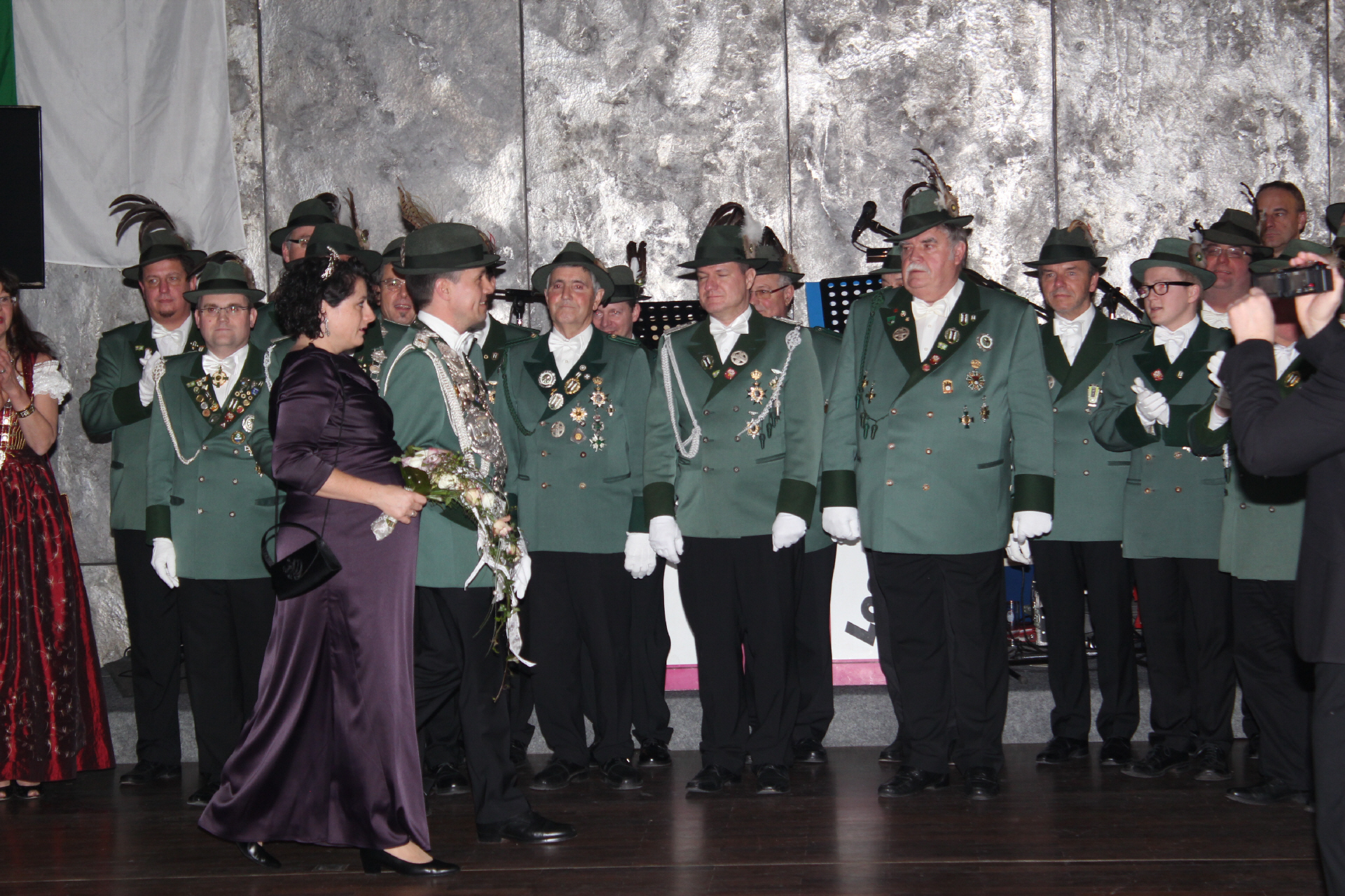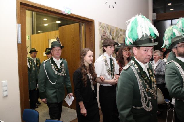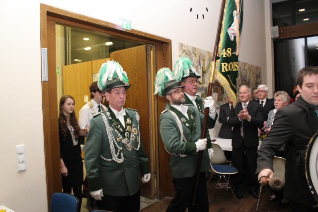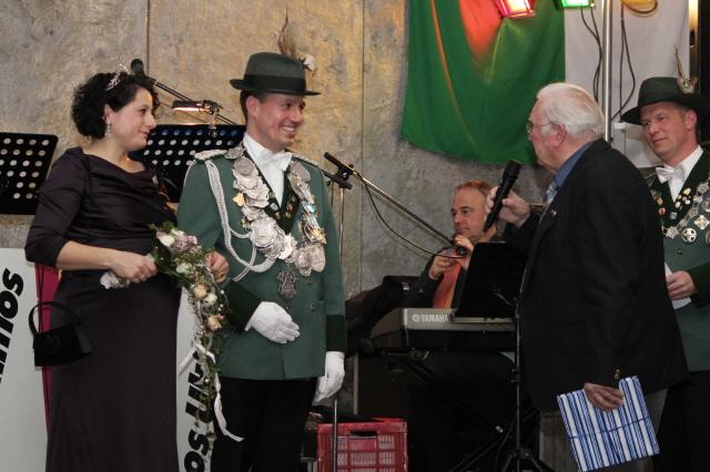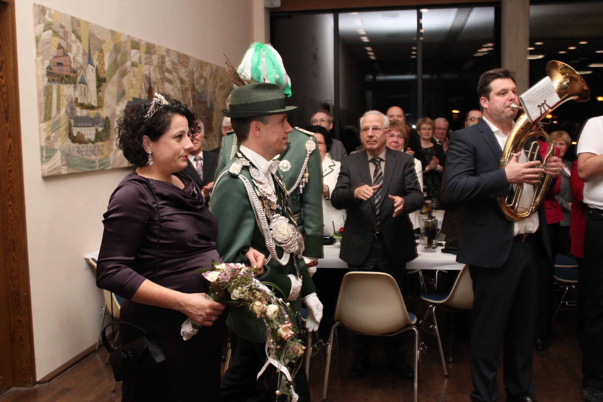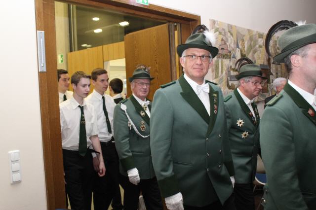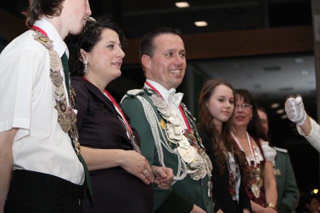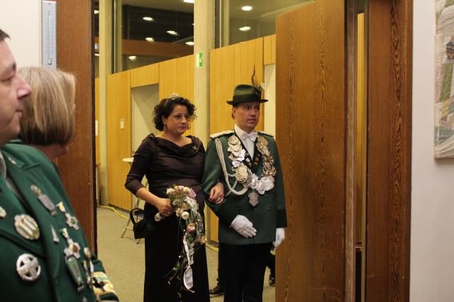 Der Höhepunkt des Tages war der Krönungsball im Rathaussaal der Stadt Bornheim. Punkt 19:30 Uhr erhoben sich die zahlreich geladenen Gastbruderschaften und Gäste im bis auf den letzten Platz besetzten Saal von ihren Plätzen und applaudierten zum Einmarsch der Schützenbruderschaft.