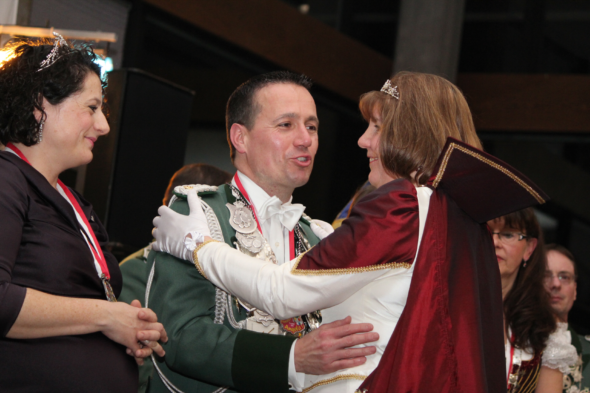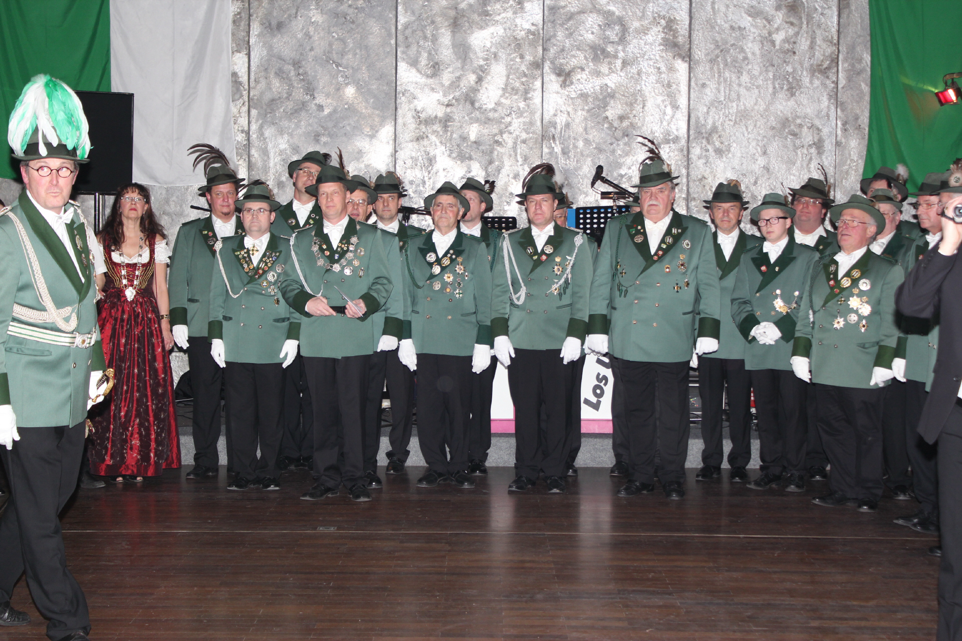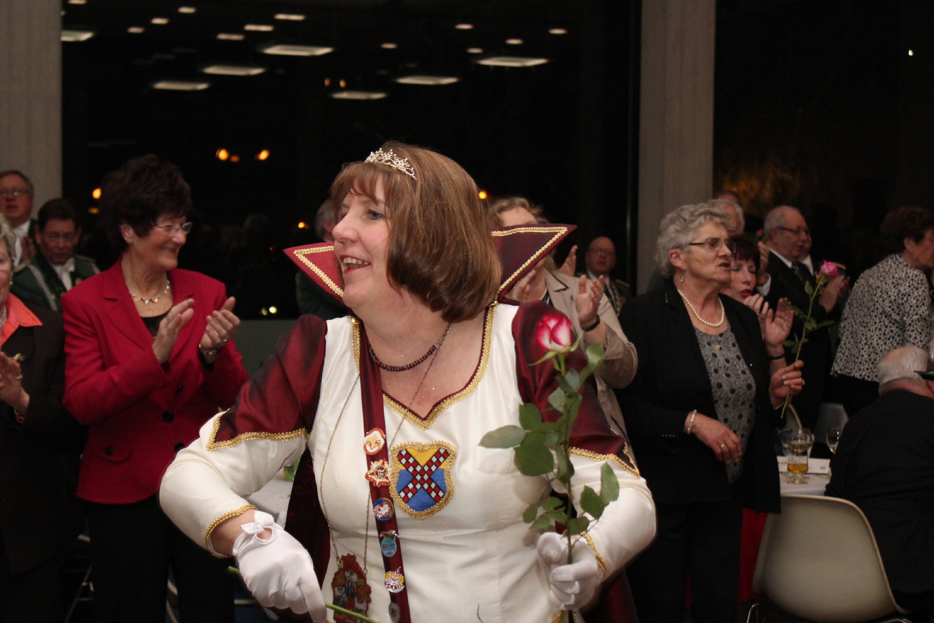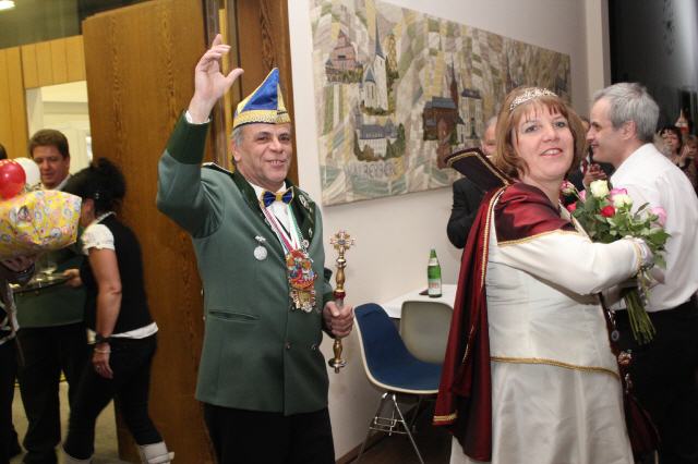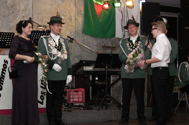 Der Höhepunkt des Tages war der Krönungsball im Rathaussaal der Stadt Bornheim. Punkt 19:30 Uhr erhoben sich die zahlreich geladenen Gastbruderschaften und Gäste im bis auf den letzten Platz besetzten Saal von ihren Plätzen und applaudierten zum Einmarsch der Schützenbruderschaft.