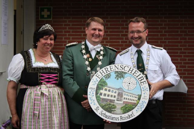 Schießen der Gastbruderschaften auf eine von Dr. Ernst Gierlich (Vorsitzender der Heimatfreunde Roisdorf) in mühevoller Handarbeit gefertigte Ehrenscheibe mit Dorfmotiven als besonderen Höhepunkt. Gewinner: St. Hubertus Schützenbruderschaft Hersel