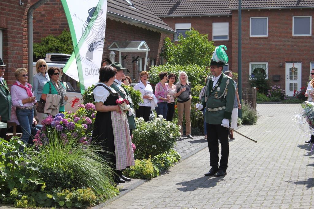 Der Tag begann mit einer Reise auf ins Unterdorf von Roisdorf, Treffpunkt Landgasthof Hamacher. Von hier aus marschierten die Schützen, begleitet vom neuen Bürgerkönig Dr. Ernst und mit einer Abordnung des Musikverein Roisdorf zum Haus des Königspaar in den Lucie-Simon-Weg. Hier begrüßten wir das Königspaar.