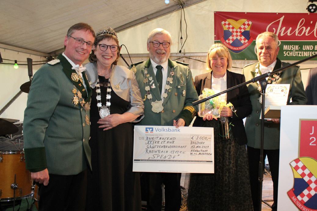 Zu guter Letzt betraten das Roisdorfer Königspaar Wolfgang & Christa Mertgen die Bühne, um dem (noch) amtierenden Königspaar der St. Sebastianus und St. Hubertus Schützenbruderschaft Rheinbach 1313 Udo & Hannelore Enders einen symbolischen Scheck über 2.000€ zu überreichen. König Udo Enders bedanke sich sehr herzlich für die großzügige Unterstützung der Wiederaufbaumaßnahmen, die aufgrund der durch die Flut 2021 verursachten Schäden notwendig geworden waren.