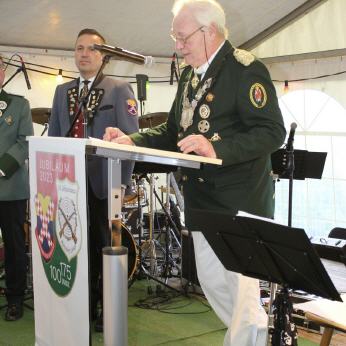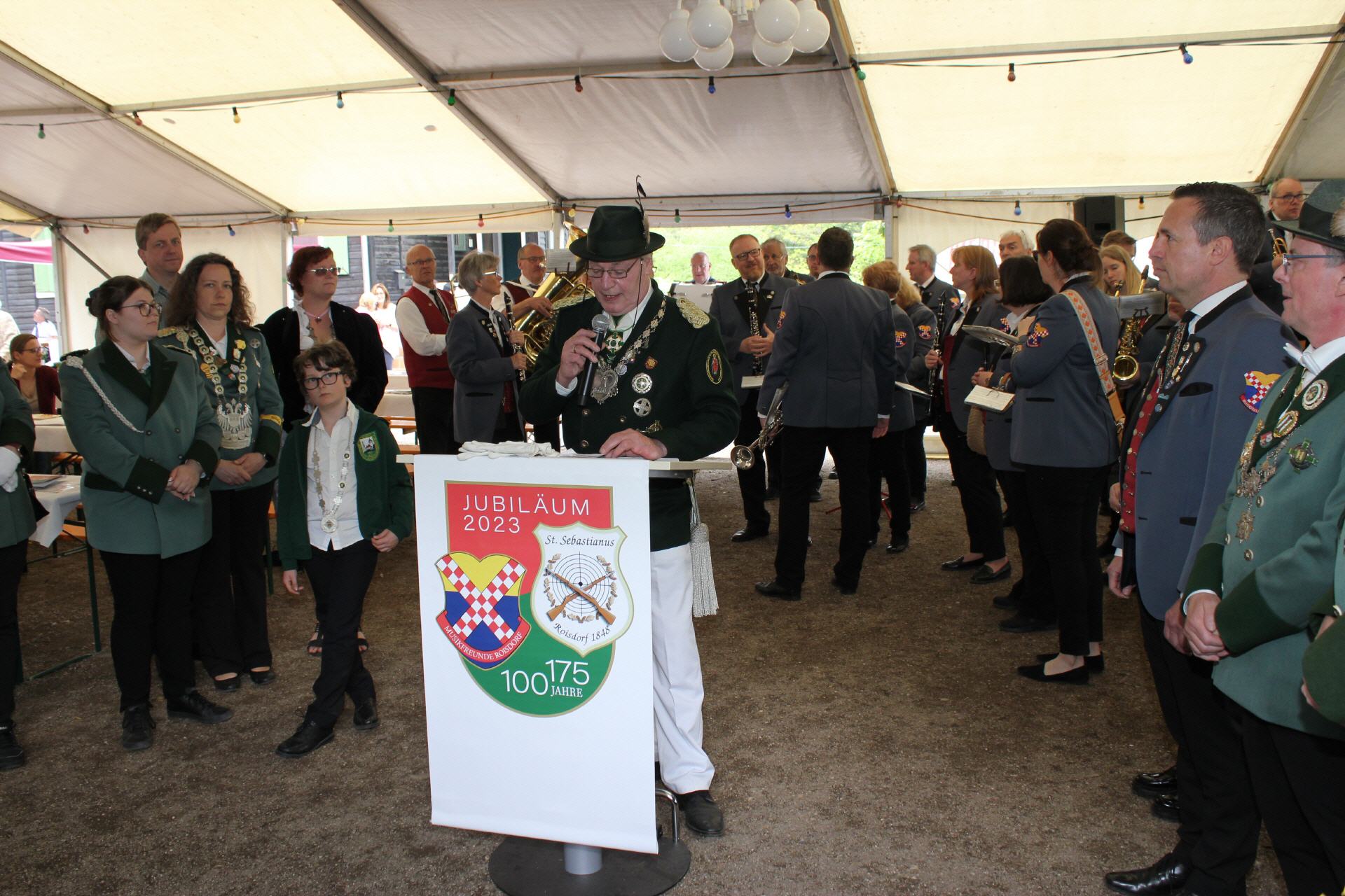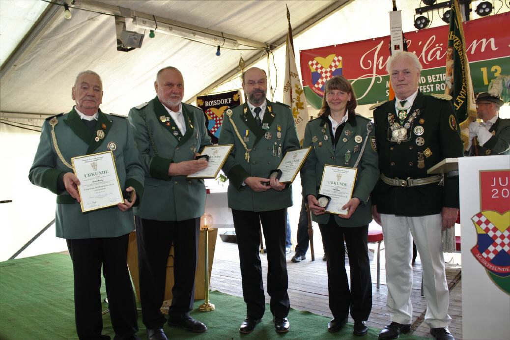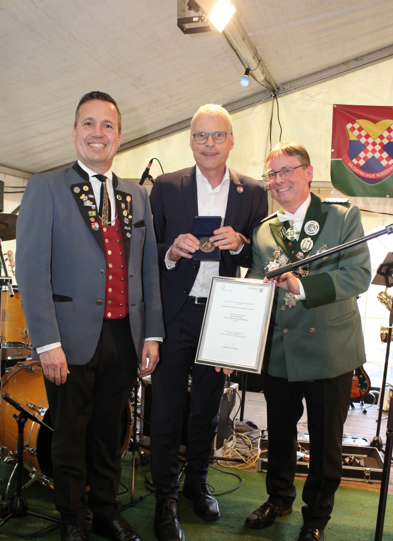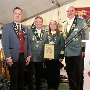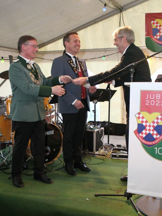 Nachdem der Ortsvorsteher für Roisdorf, Karl-Heinz Nauroth, ebenfalls gratuliert hatte, überreichte der stellvertretende Diözesanbundesmeister Peter Horst den Roisdorfer Schützen die Hochmeisterplakette des Bund der Historischen Deutschen Schützenbruderschaften zu ihrem Jubiläum.