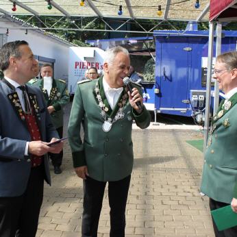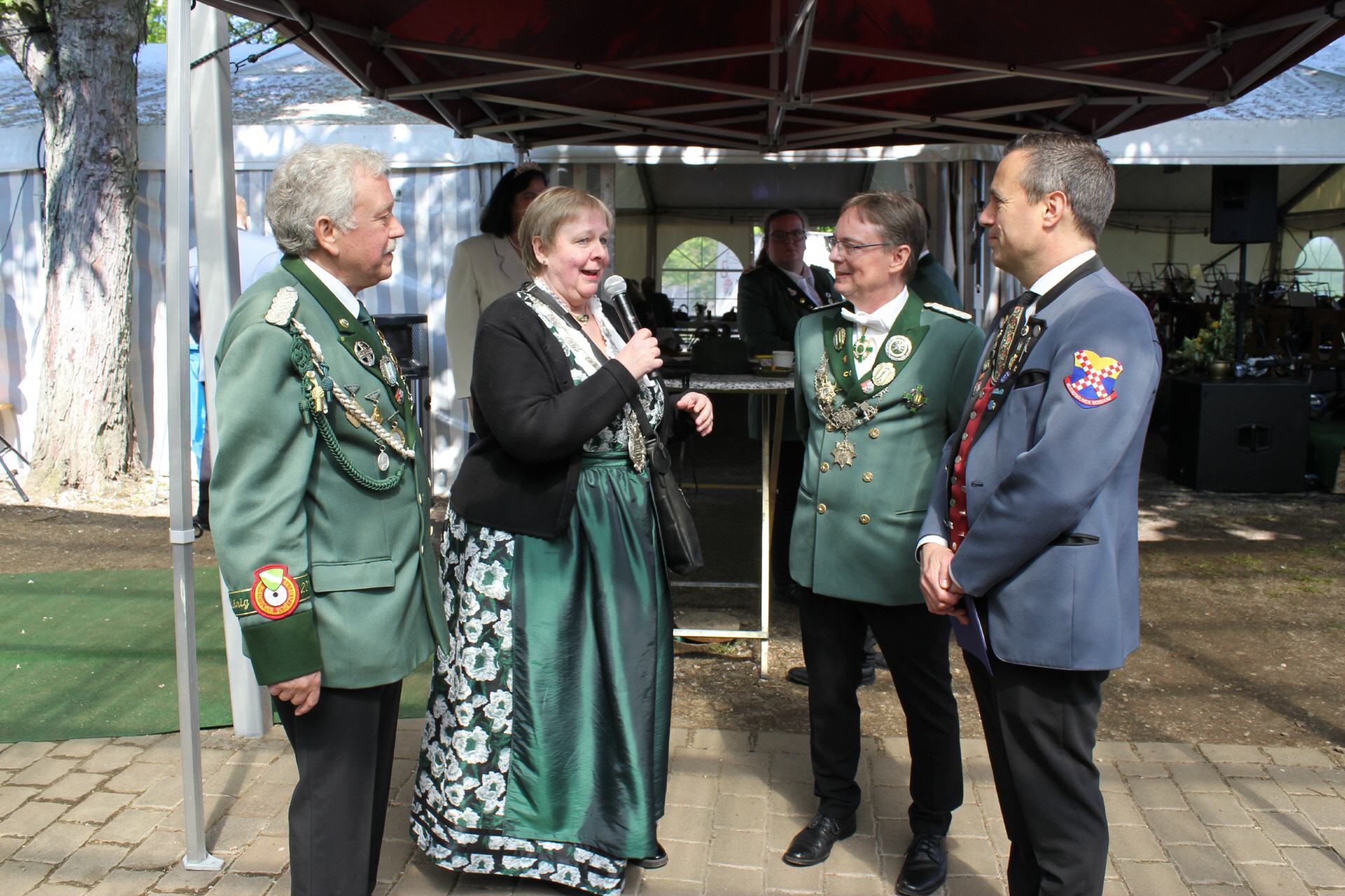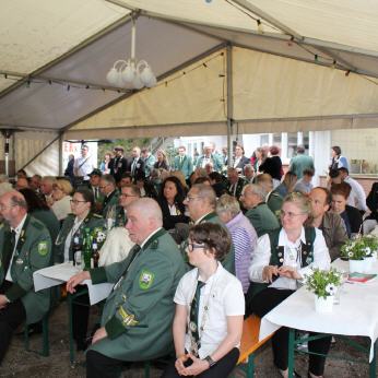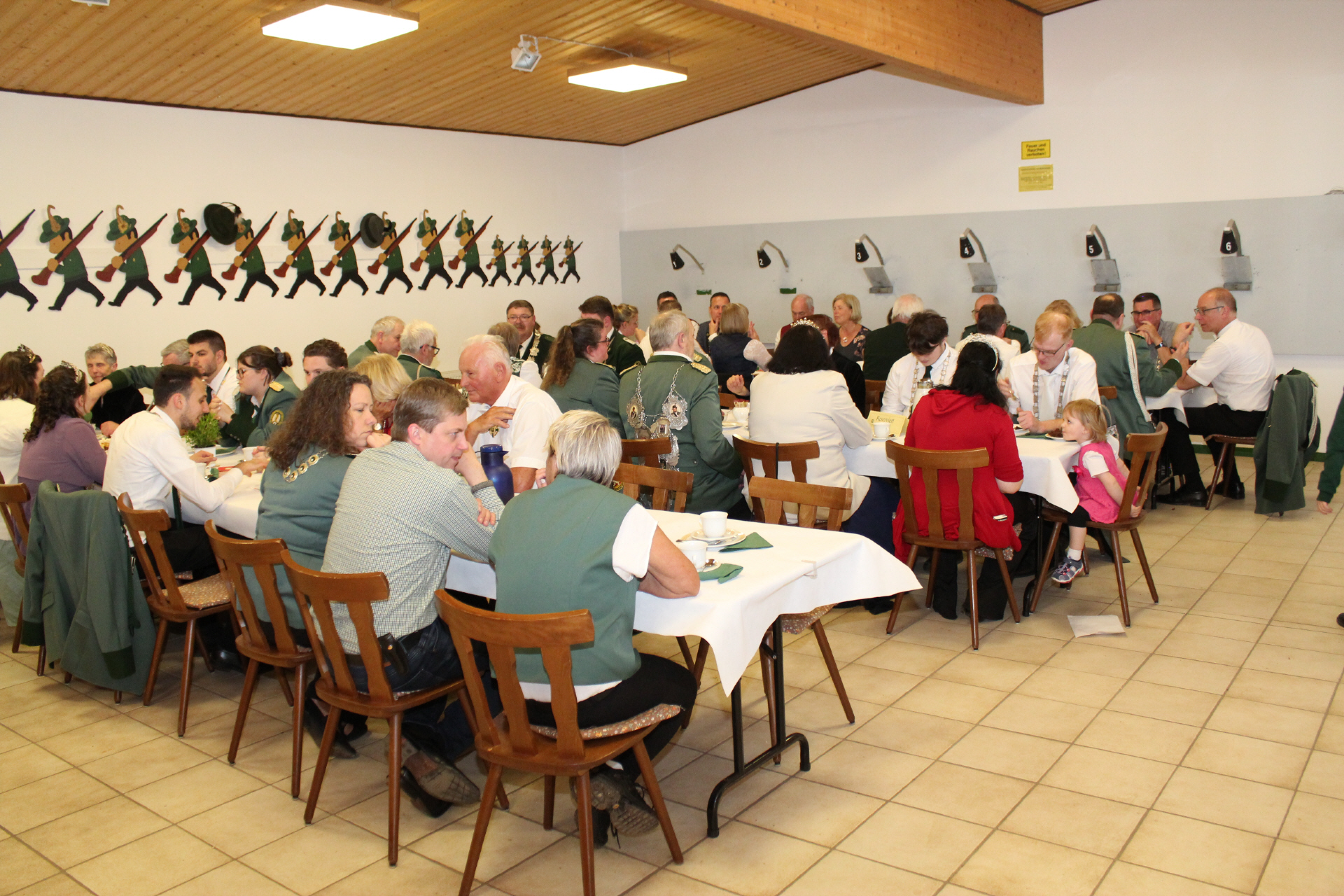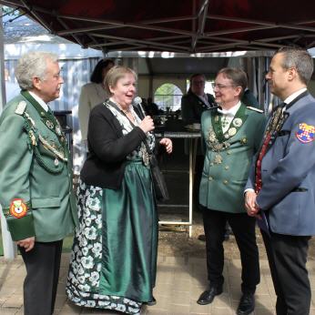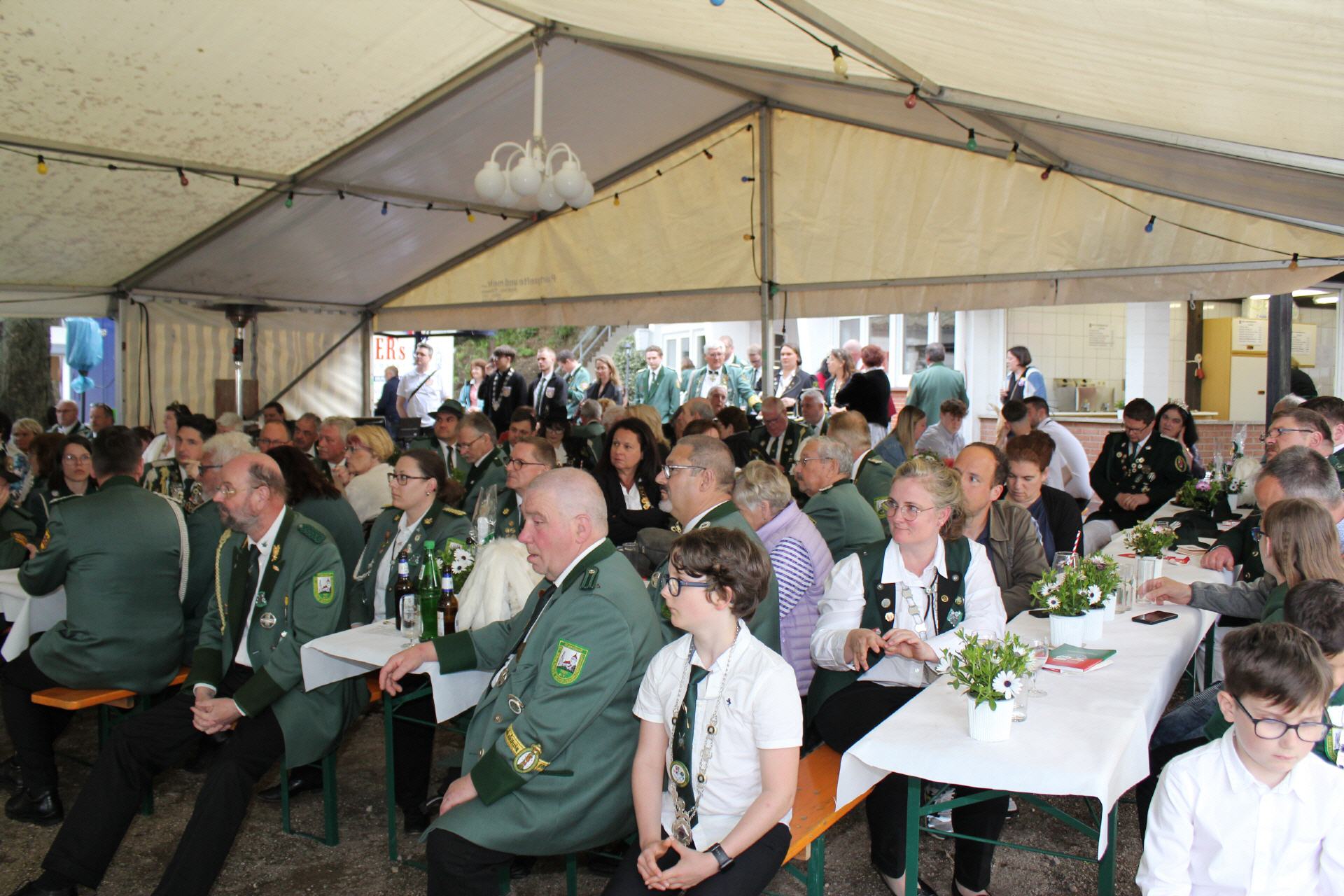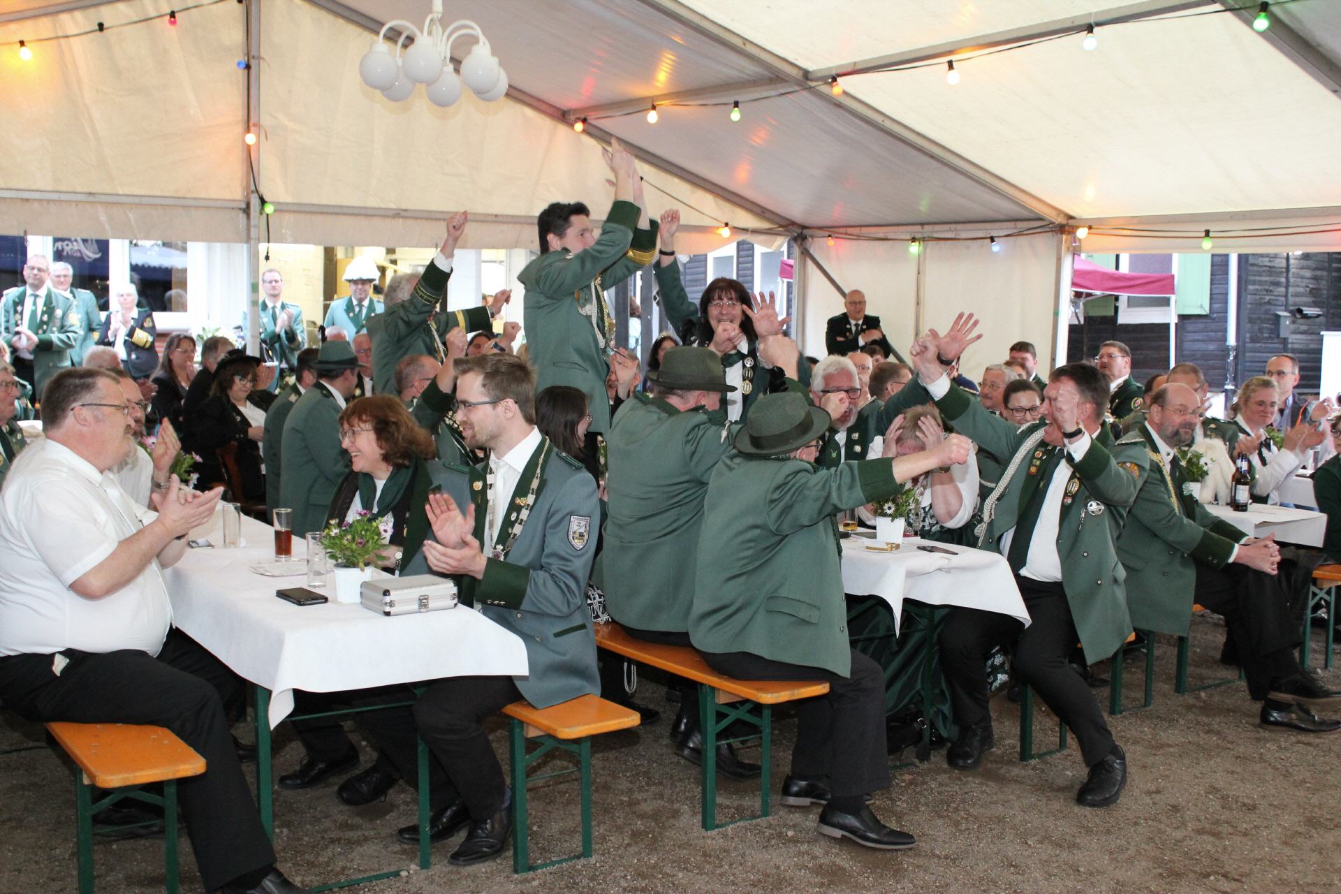 Nach dem Ende der Messe wurden die Schießwettbewerbe fortgesetzt und gleichzeitig nutzten viele Gäste die Möglichkeit zum Frühstück. Hinter der Theke unterstützten dabei erneut tatkräftig die Frauen der kfd Roisdorf. Anschließend hatten viele Ortsvereine und Gastbruderschaften die Gelegenheit, den Jubilaren zu gratulieren.