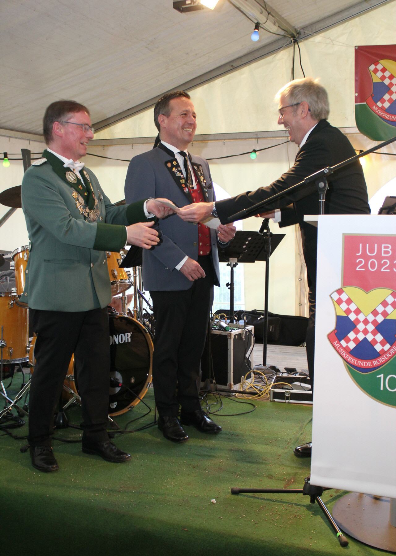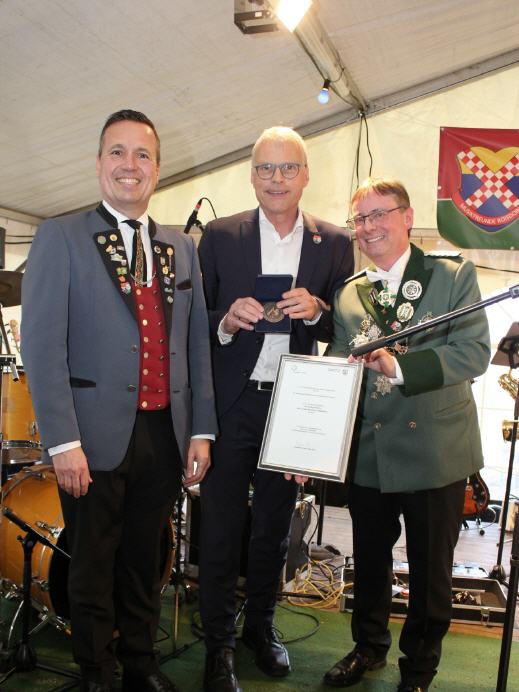 Anschließend gratulierte Oliver Krauß, Mitglied des Landtages NRW und aktives Mitglied der Musikfreunde, ganz herzlich zu den Jubiläen und überreichte den Roisdorfer Schützen in Anerkennung ihres besonderen Engagements die Ehrenplakette des Landes Nordrhein-Westfalen.