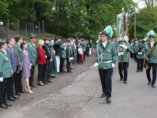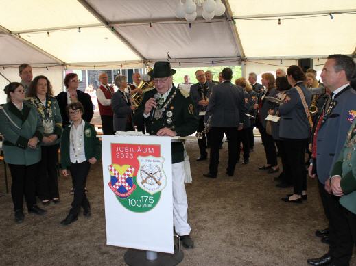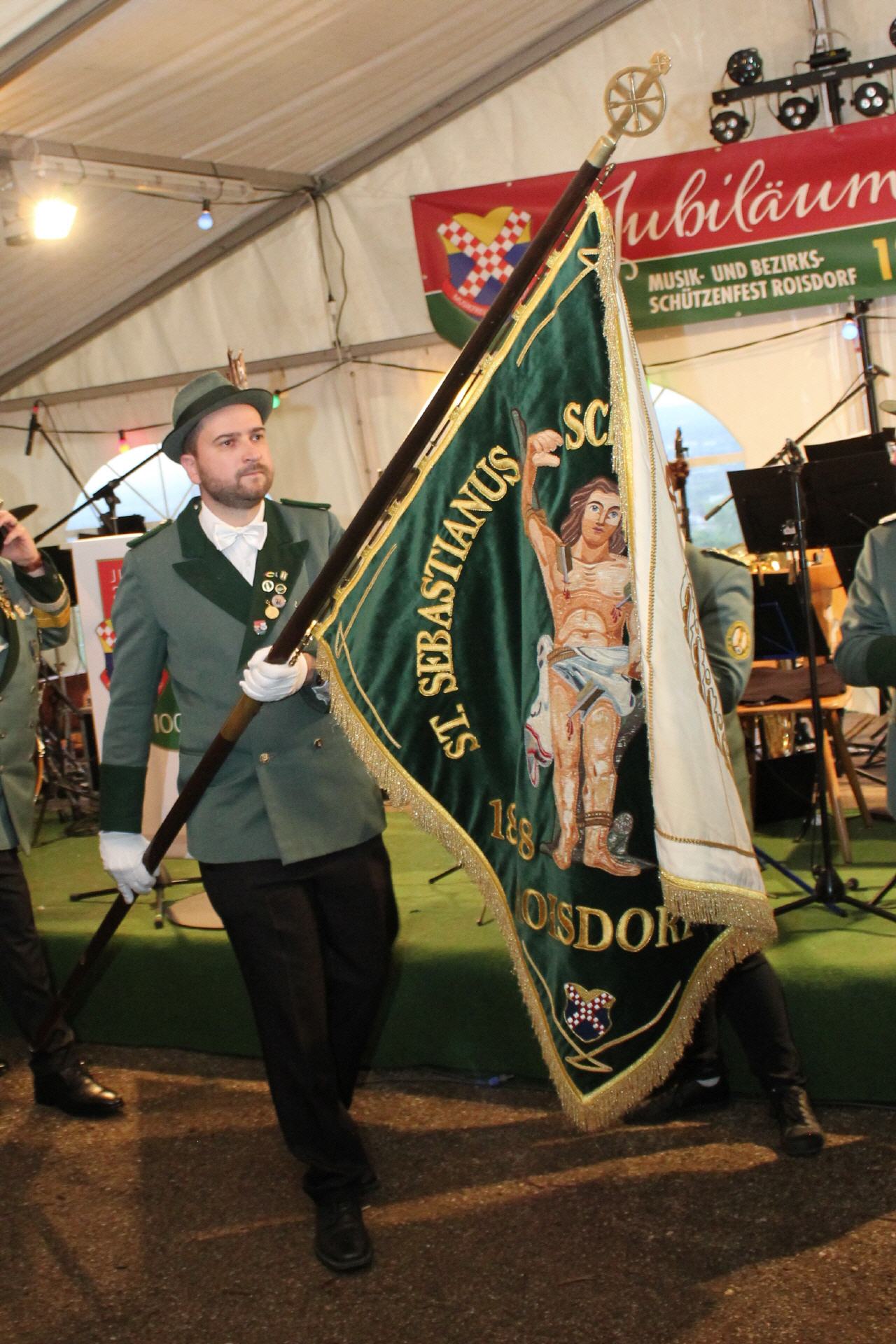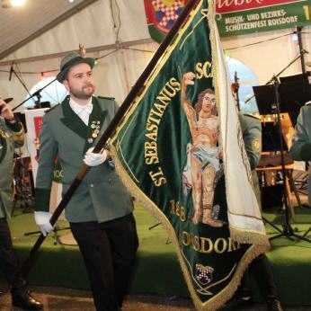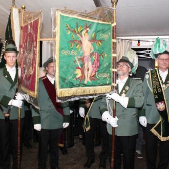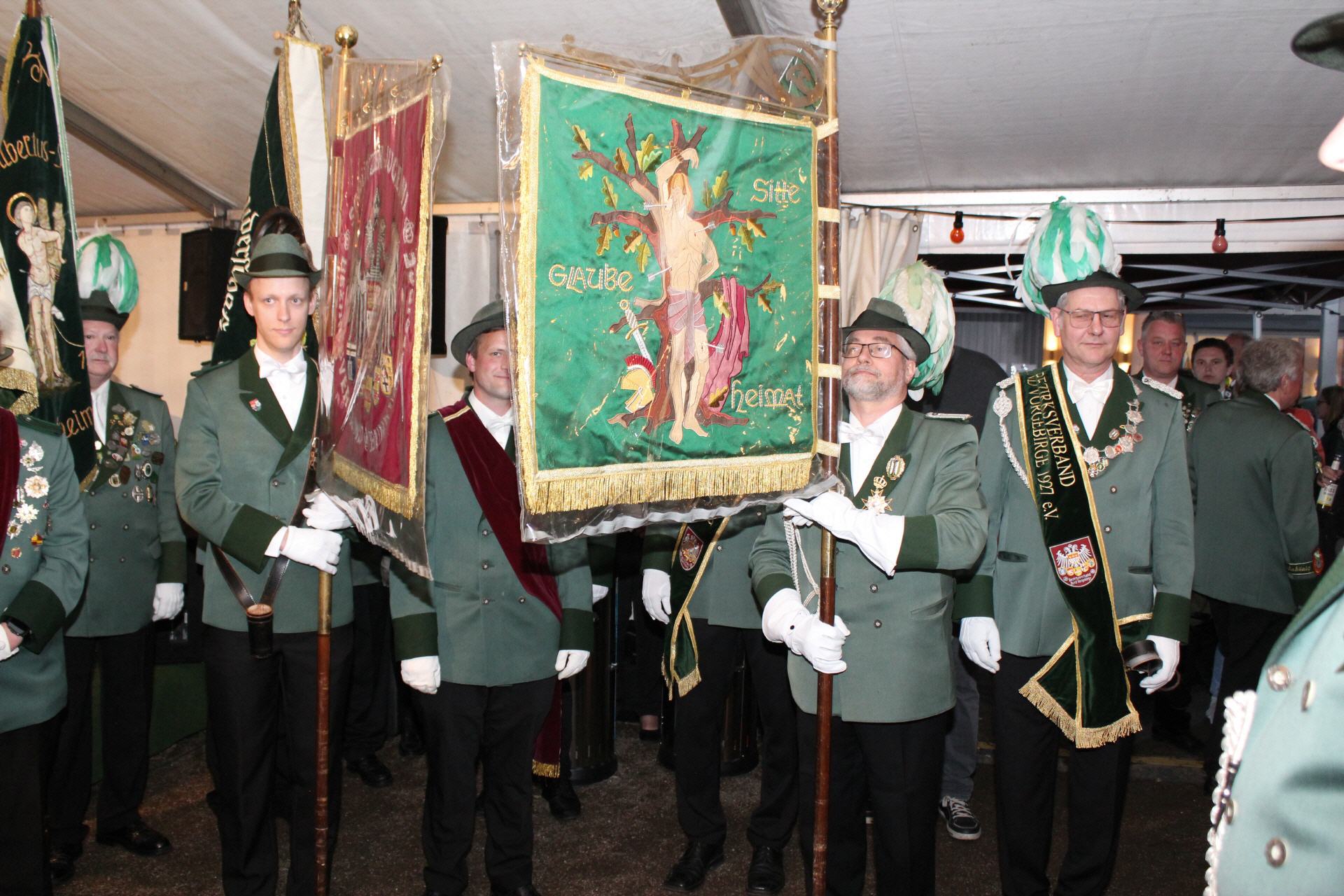 Dann war es an Hauptmann Frank Plate zum Antreten der Fahnenabordnungen aufzurufen. Unter musikalischer Begleitung der Musikfreunde Roisdorf marschierten die Fahnenträger der Bruderschaften des Bezirks in das Zelt und versammelten sich zur Übergabe der Bezirksstandarten.