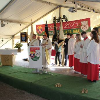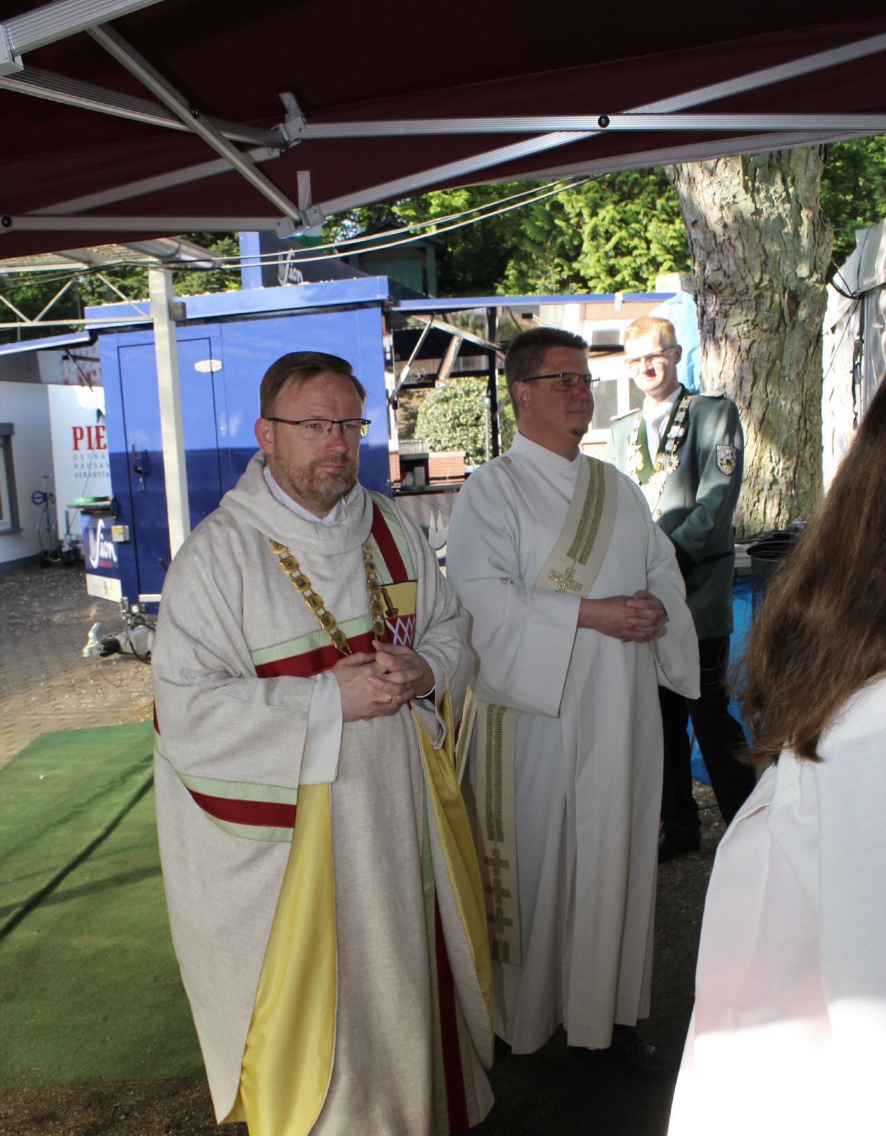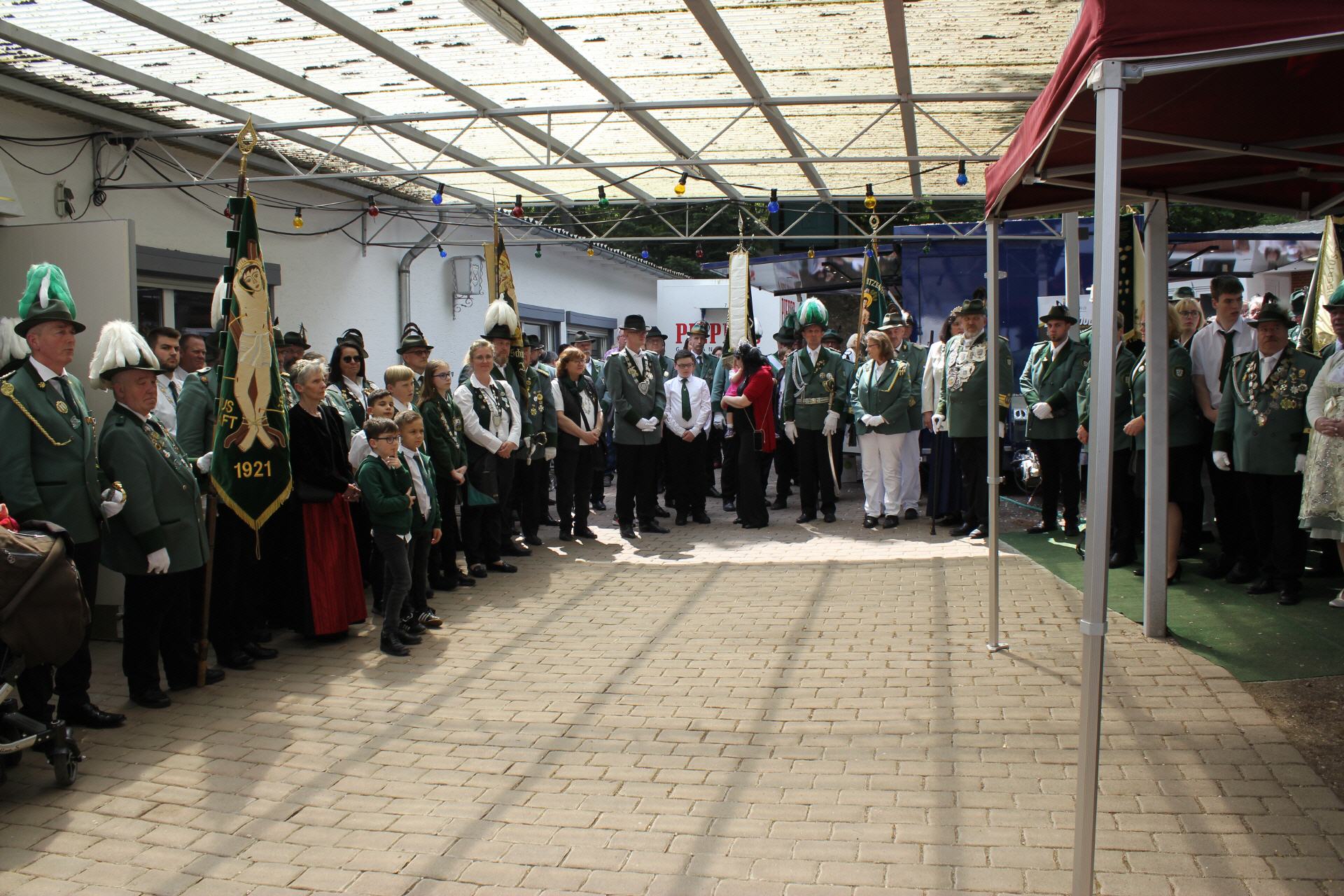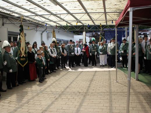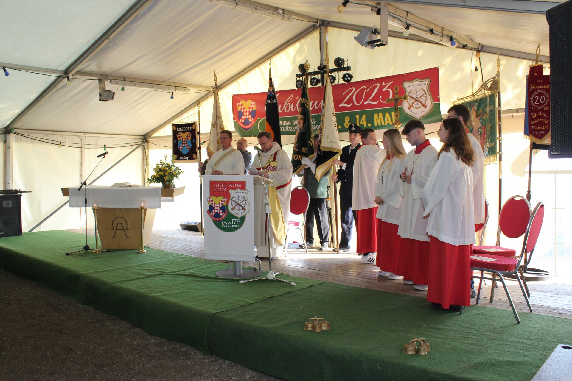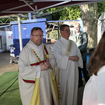 Der Sonntag startete schon am sehr frühen Morgen mit Aufräumarbeiten, damit um 09:00 Uhr alles für die Messe bereit war. Bei wunderschönem Wetter zelebrierten Bezirkspräses Silvio Eick und der Präses der Roisdorfer Schützen, Adi Halbach die sehr gut besuchte Messe, unter musikalischer Begleitung der Musikfreunde Roisdorf und in Anwesenheit der Fahnenabordnungen der Ortsvereine.