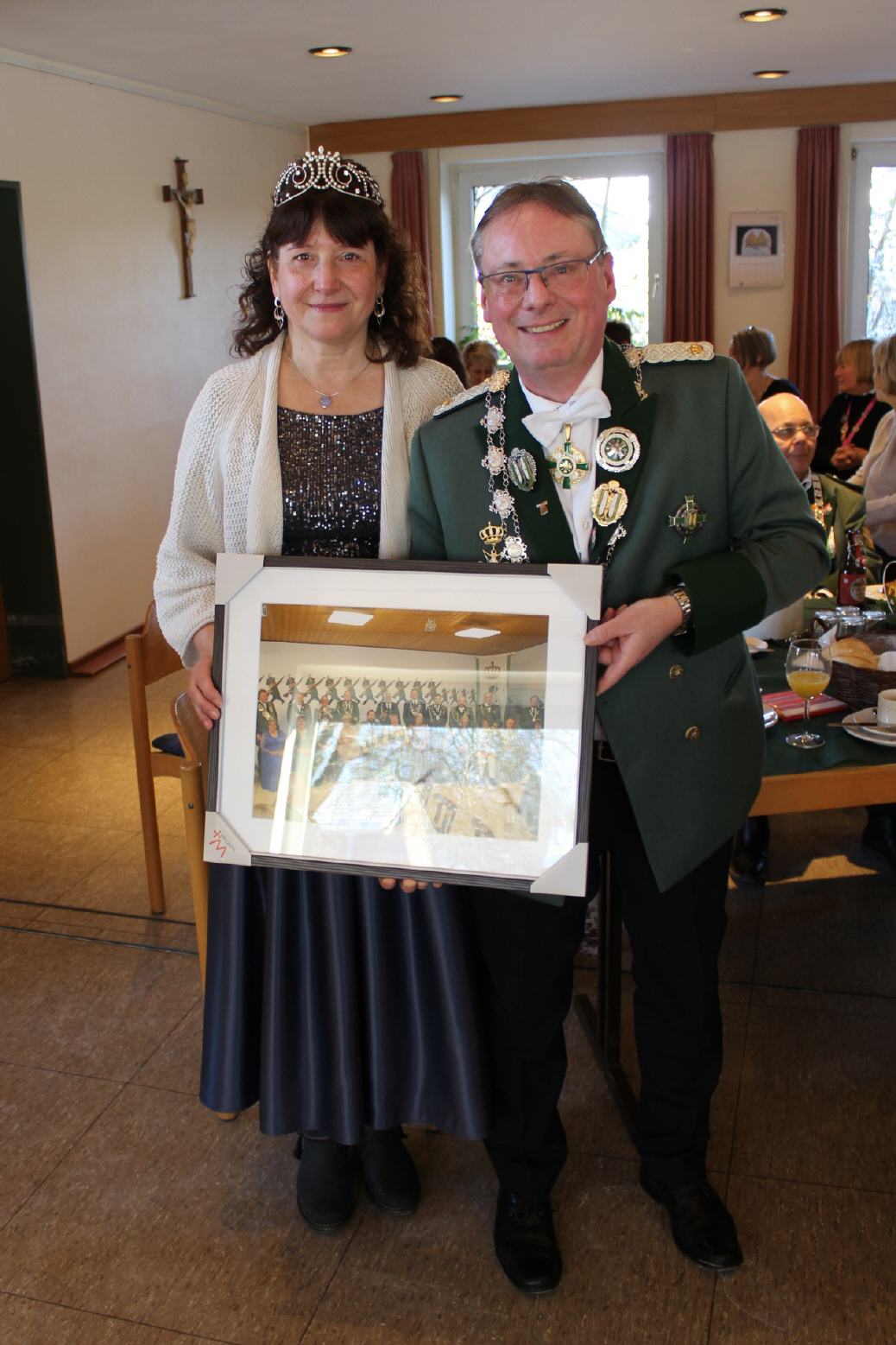Anlässlich ihres 60. Geburtstags lud Königin Gabi Klemmer anschließend zum Kuchen ein, den Schützenschwester Nicole Pällmann gebacken hatte. Schließlich bedankte sich der 2. Brudermeister Dr. Mark Steinhauer beim Königspaar für ihr bisheriges Engagement im Rahmen der Feierlichkeiten zum 175sten Jubiläum der Roisdorfer Schützenbruderschaft mit einem gerahmten Bild vom Kaiser- und Königspaaretreffen des Bezirksverbands Bund Vorgebirge, das die Roisdorfer Schützen im November 2023 ausgerichtet hatten.