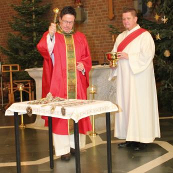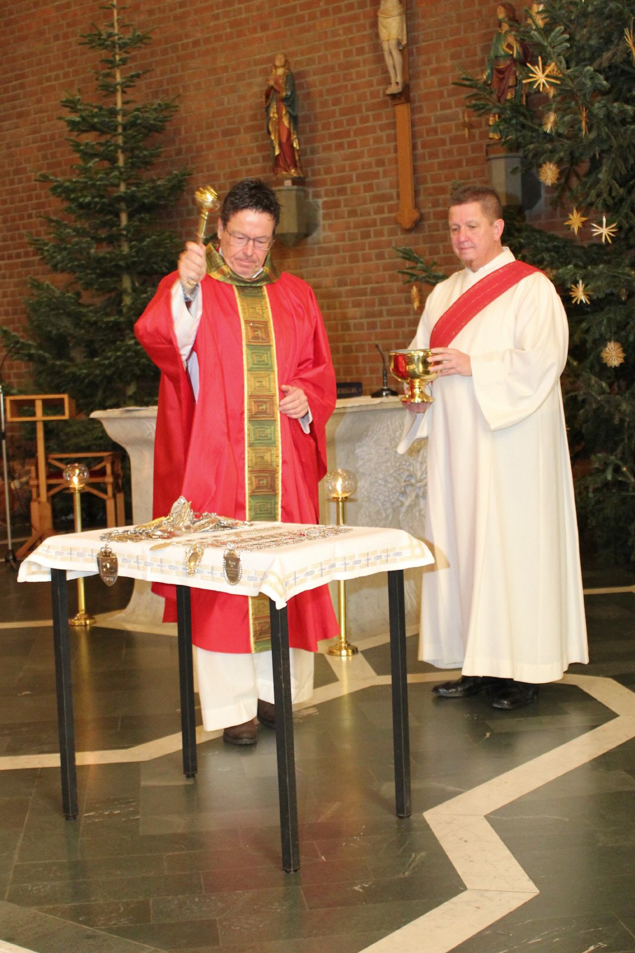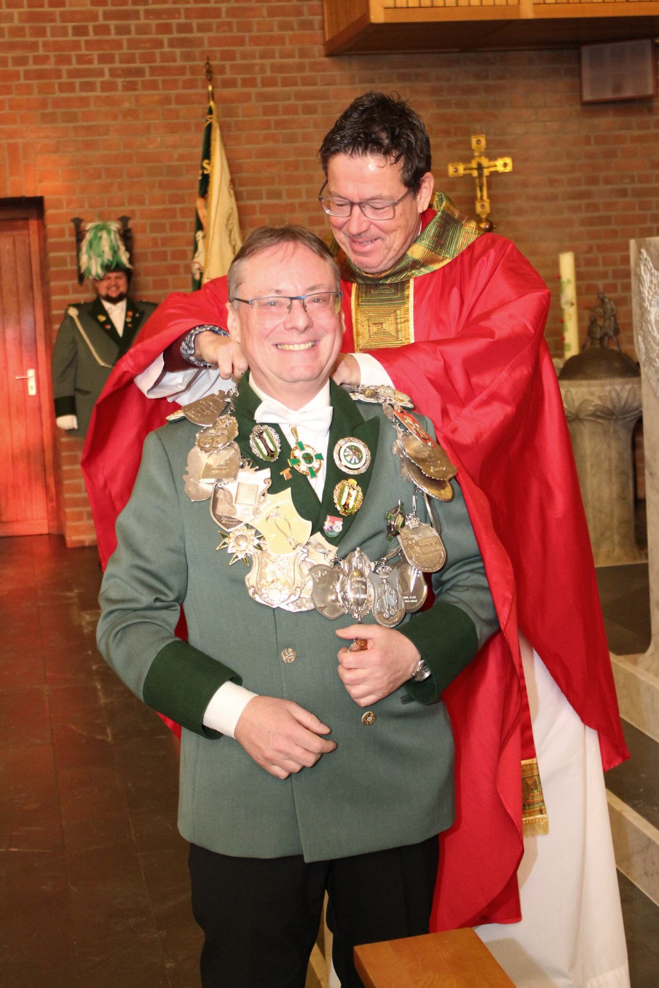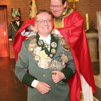 Das wieder sehr gelungene Festhochamt, in dessen Verlauf traditionell auch die Königskette sowie die Ketten der Bürgermajestäten gesegnet wurden, hielten Pfarrer Wolfgang Pütz und Präses & Diakon Adi Halbach. Die Botschaft der diesjährigen Predigt war, dass alle Menschen wertvoll sind. Und damit die Gemeinde sich diese Botschaft auch immer wieder bewusst macht, ließ Präses Adi Halbach Kugelschreiber mit der Aufschrift „Du bist wertvoll“ an die anwesenden Messebesucher verteilen.