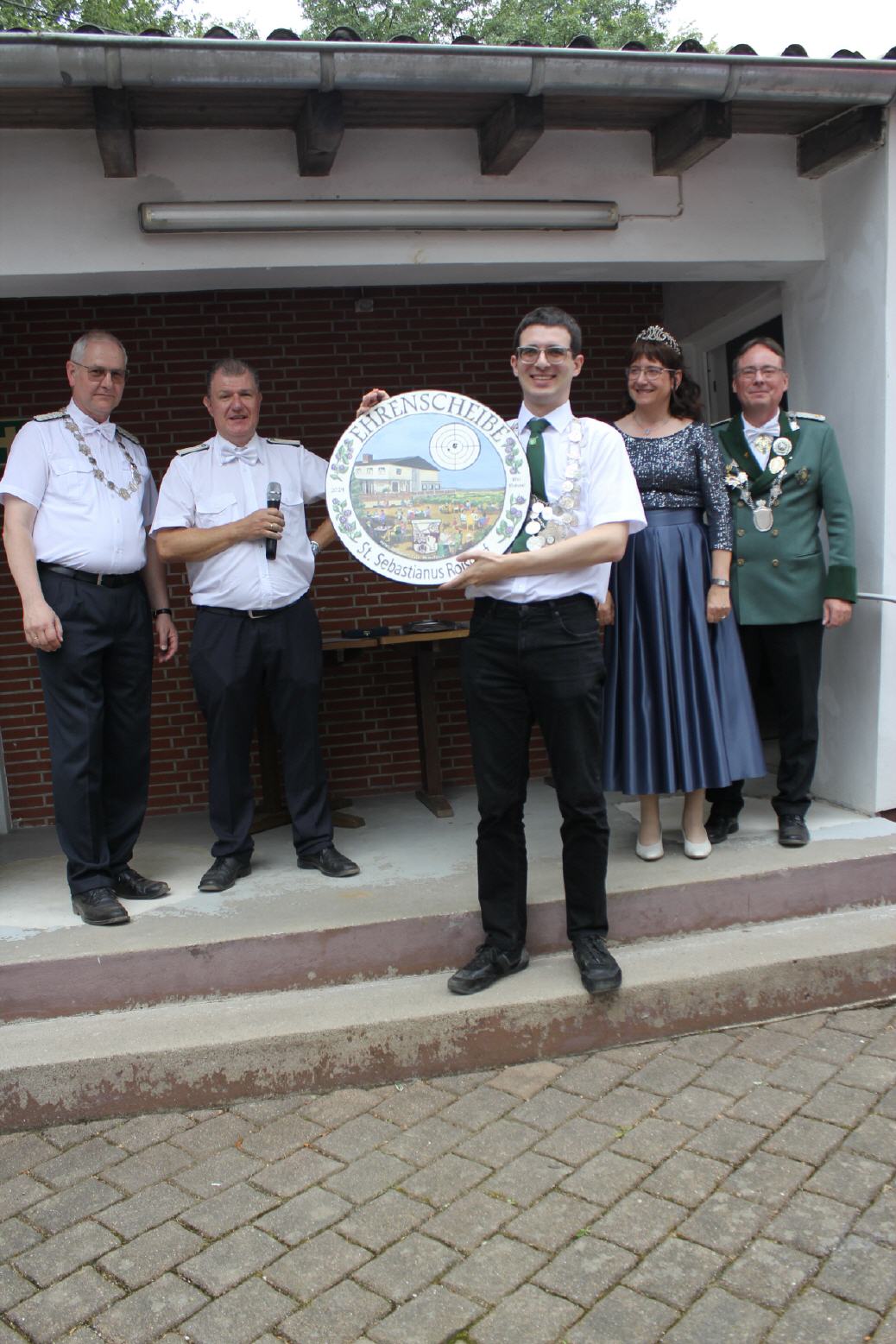 Letztere waren dafür beim Schießen auf die Ehrenscheibe erfolgreich: Schützenkönig Daniel Schüller holte mit dem besten Schuss die von Dr. Ernst Gierlich in Handarbeit gefertigte und bemalte Holzscheibe, die in diesem Jahr das ehemalige Hotel/Restaurant „Heimatblick“ zeigt.