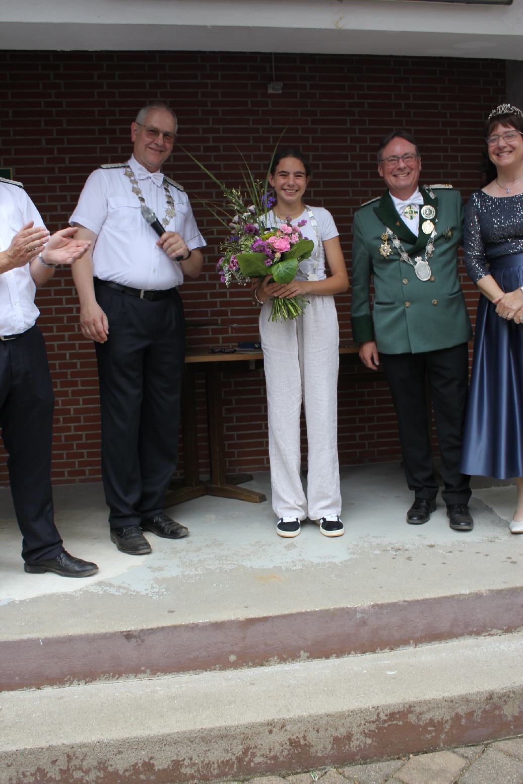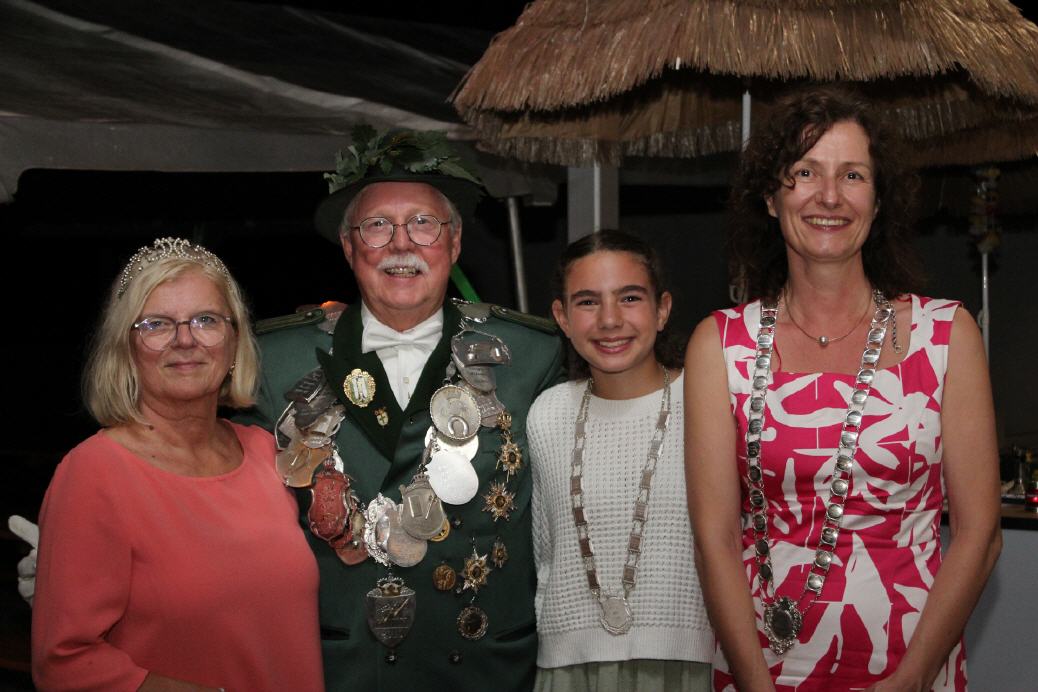 Schließlich gab es noch einen spannenden Kampf beim Bürgerprinzenschiessen: Der Vogel erwies sich als zäh und neue Bürgerprinzessin wurde erst mit dem 86. Schuss Marie Zimmermann, Enkelin unseres Schützenpaares Christian und Hubertine Fritzen und Schwester der Bürgerprinzessin 2023/24 Hanna Zimmermann.