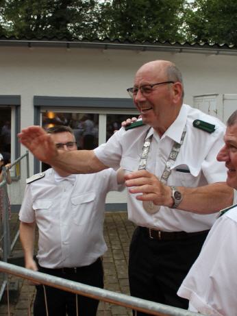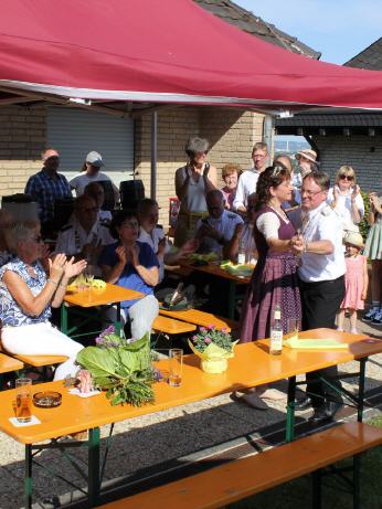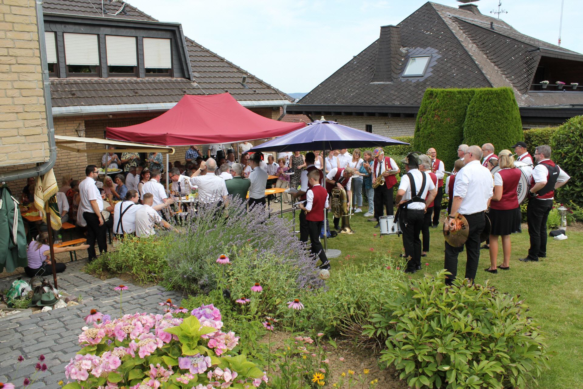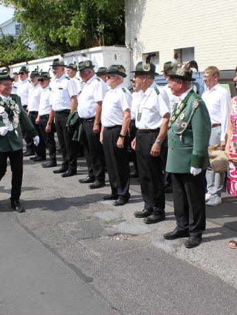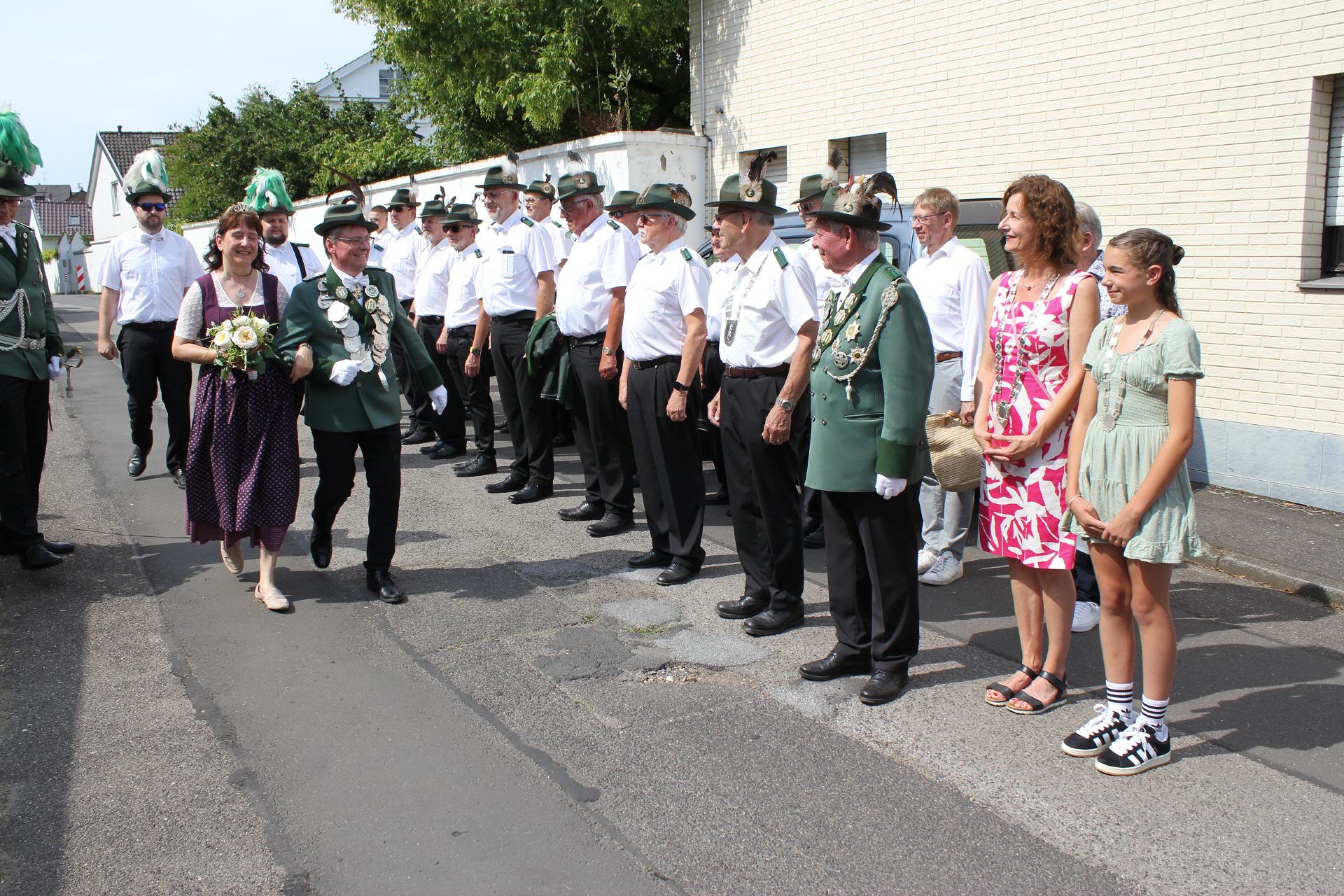 Gegen 16:00 Uhr traf sich die Bruderschaft bei strahlendem Wetter im Oberdorf zur Abholung und Verabschiedung des amtierenden Königspaares Walter & Gabi Klemmer. Zusammen mit einer Abordnung der Roisdorfer Musikfreunde ging es dann zum Königspaar, das mit Unterstützung vieler fleißiger Helfer Speis und Trank für die Schützen und Schützenfrauen vorbereitet hatte.