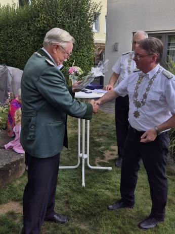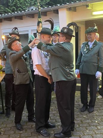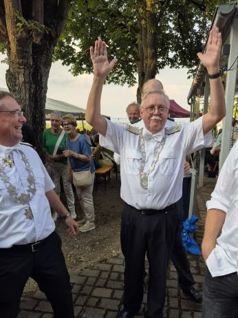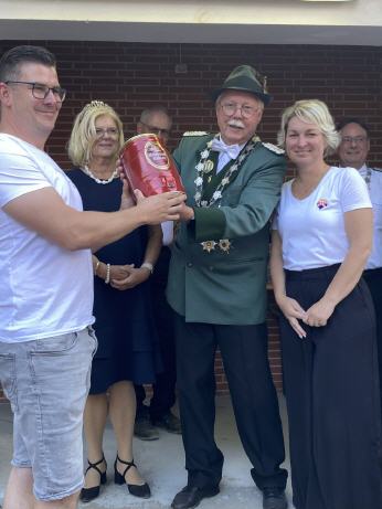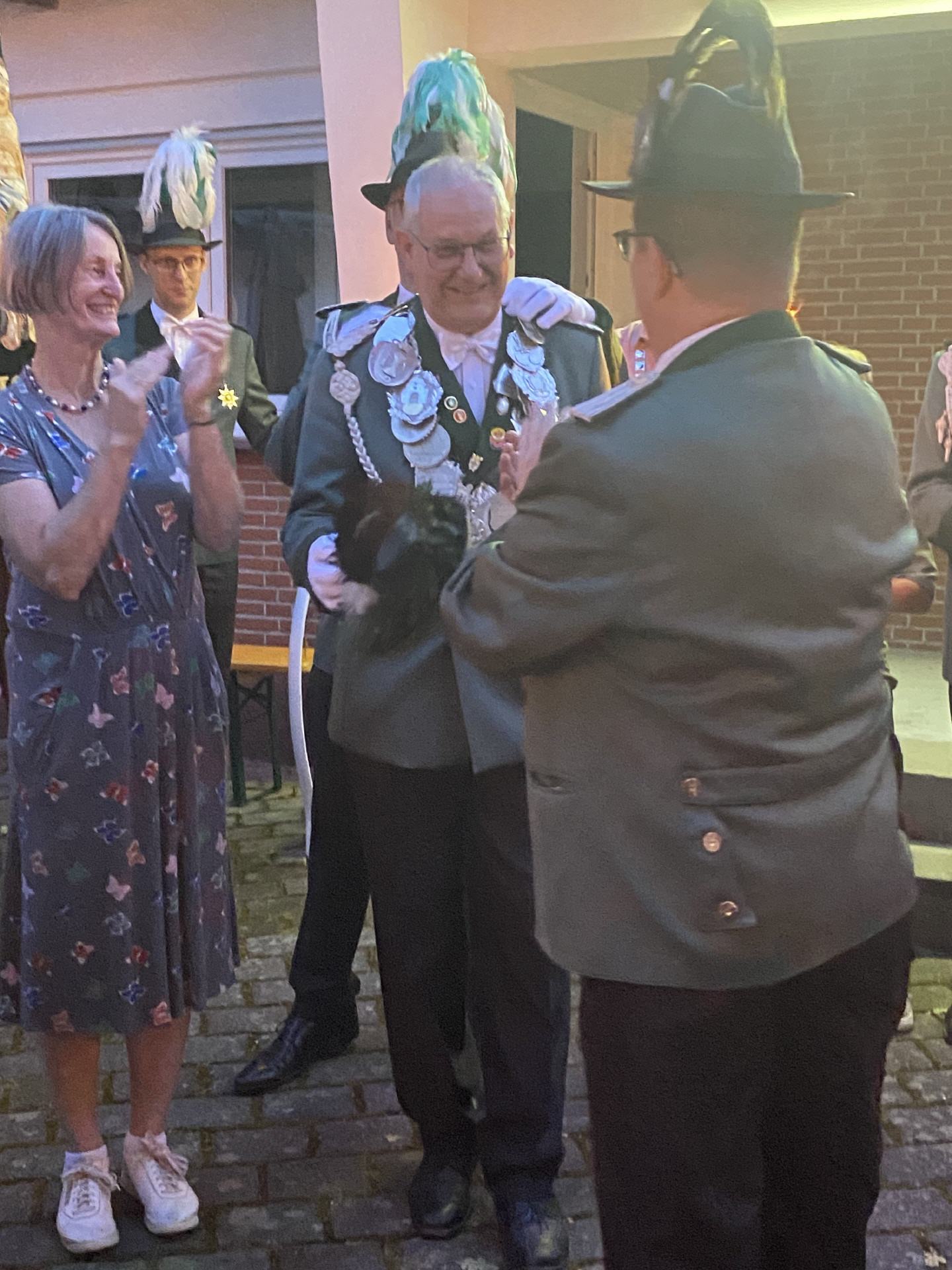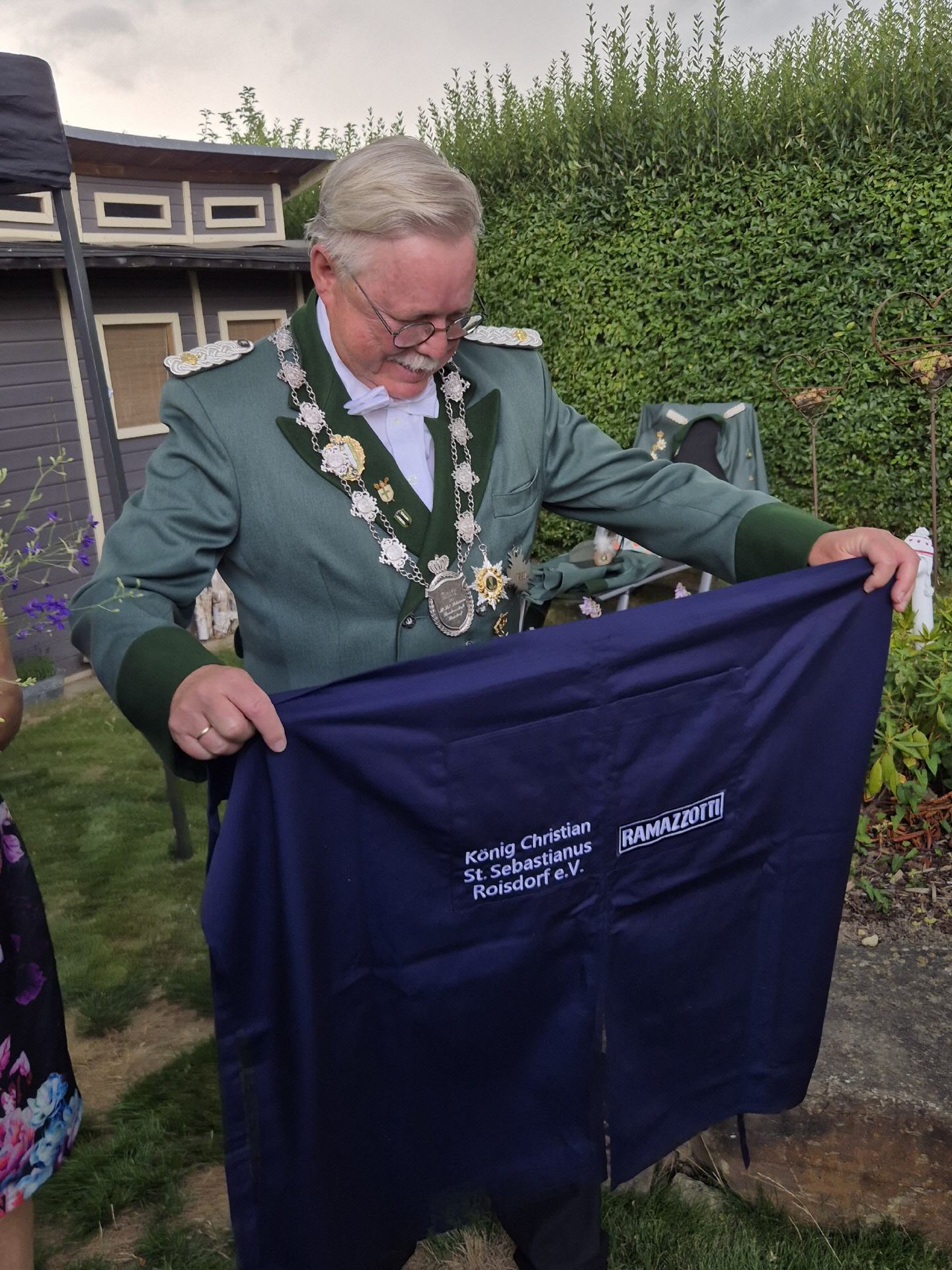 Nachdem sich alle gestärkt hatten, ließ unser 1. Brudermeister Walter Klemmer das vergangene Königsjahr noch einmal Revue passieren und dankte dem scheidenden Königspaar für ein herausragendes Jahr. Dabei überreichte er neben Königsorden und Königinnenbrosche u.a. die inzwischen traditionellen Königsschürzen.