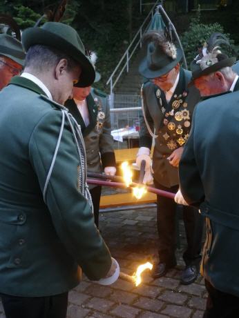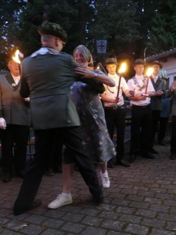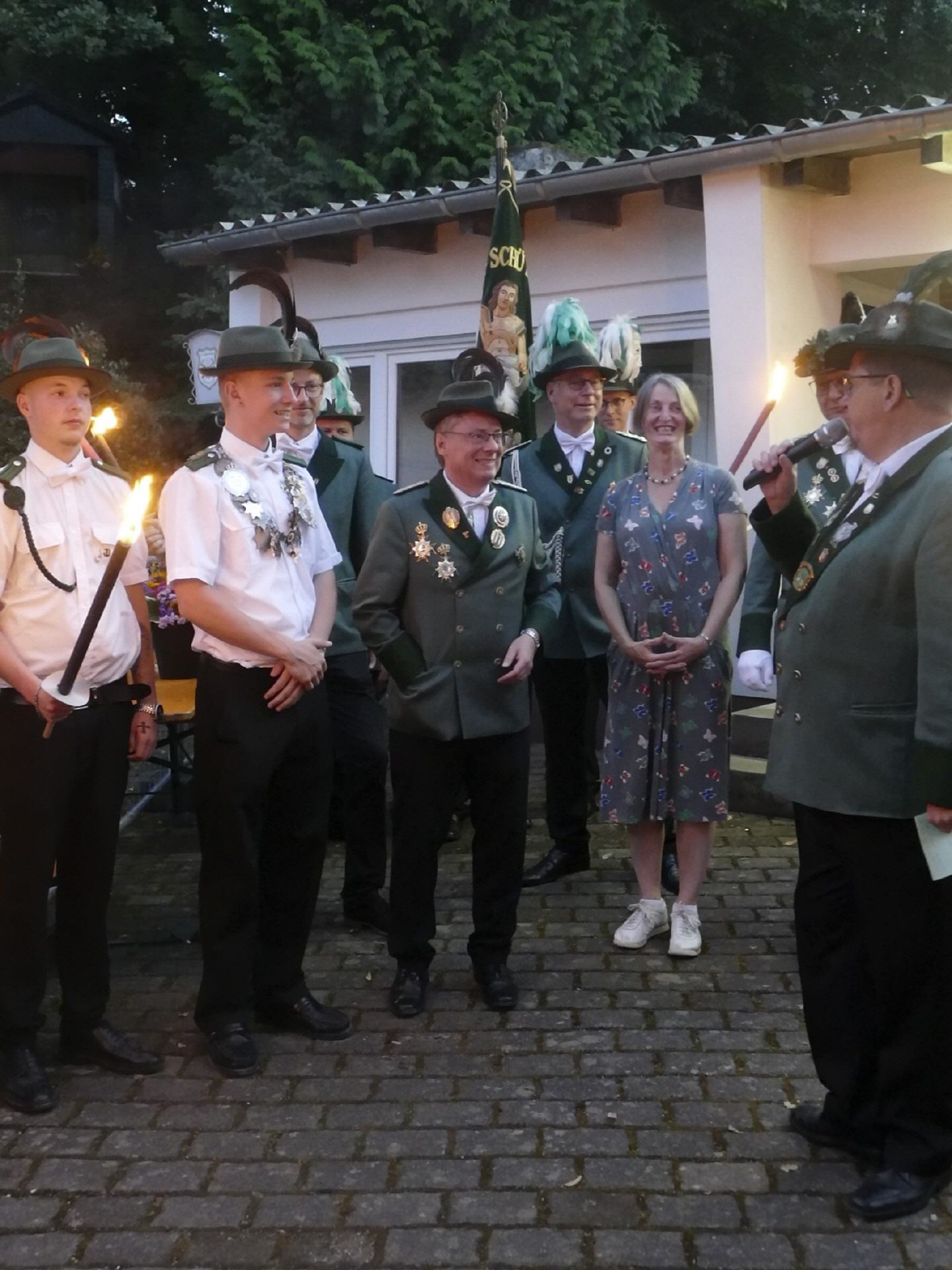 Nach zahlreichen Glückwünschen versammelte sich die Bruderschaft bei Fackelschein zur feierlichen Krönung der neuen Majestäten, durchgeführt von unserem 1. Brudermeister und Präses Adi Halbach.